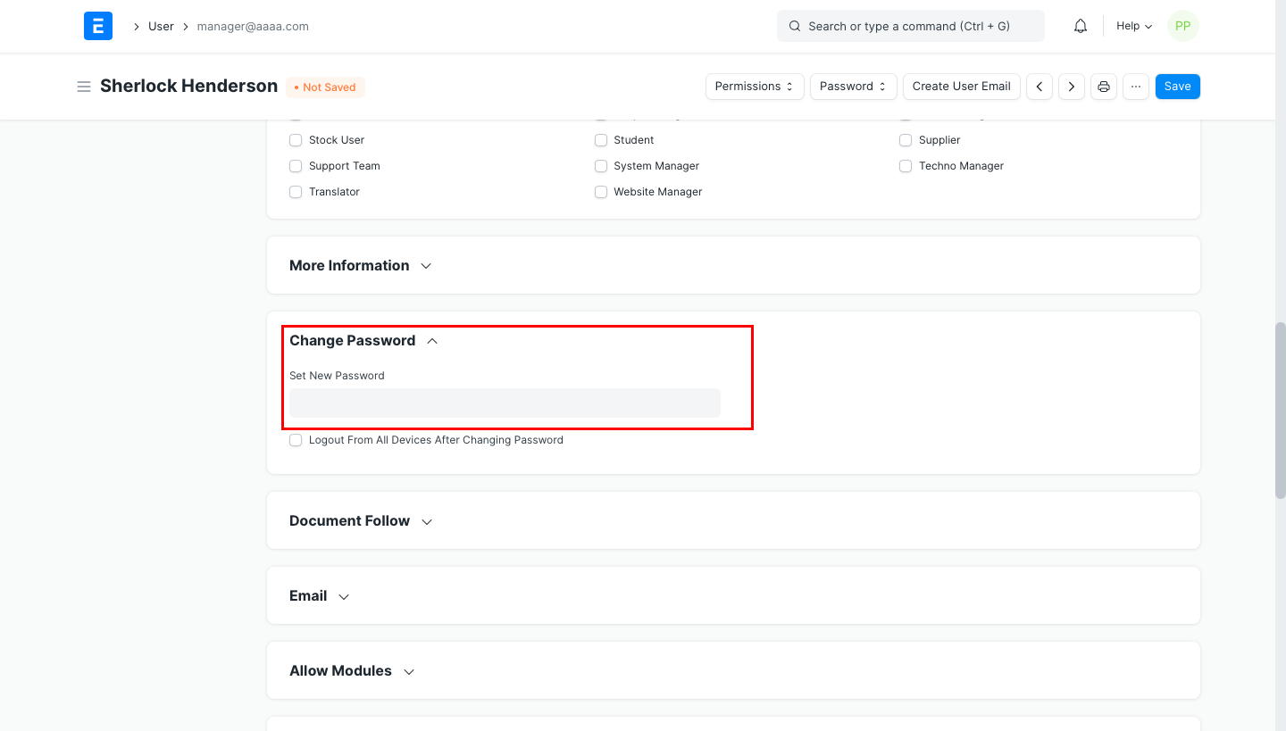 3) Go to 'Change Password' section, enter the new password and save the form to save the changes